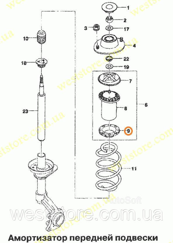 Прокладка встановлюється між передньою пружиною (зверху) і посадковим місцем передній пружини. Популярну назву проставка. Назва каталогу GM ізолятор пружини передньої верхній. Для всіх років випуску. Оригінал, GM, Корея. На скріншоті позиція 9